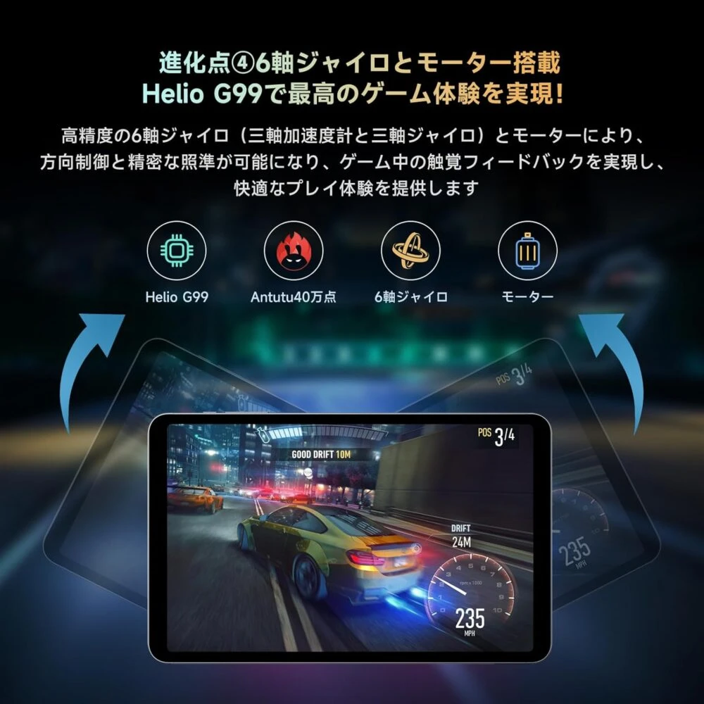 Widevine L1対応、6,050mAh大容量バッテリー内蔵、デュアルスピーカー搭載の8.4型タブレットです。Helio G99 オクタコアプロセッサーを搭載しており、リーズナブルな価格に対して優れた性能を実現。コストパフォーマンスの高いAndroidタブレットとなっています。