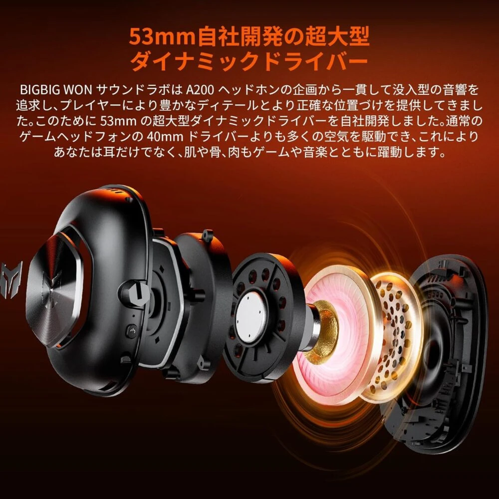 独自の53mm超大型ダイナミックドライバーを搭載しており、迫力のあるサウンド体験が可能。臨場感のあるゲーミングや映像視聴を楽しめます。