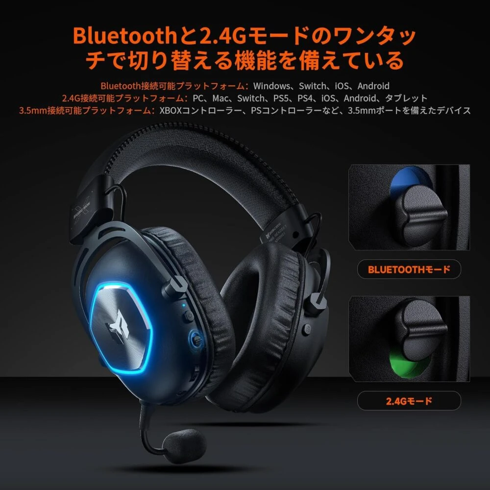 独自の53mm超大型ダイナミックドライバーを搭載しており、迫力のあるサウンド体験が可能。2.4G接続ではたったの20ms、Bluetooth接続でもわずか50msの遅延を実現しており、本格的なゲーミングにも適したヘッドセットとなっています。