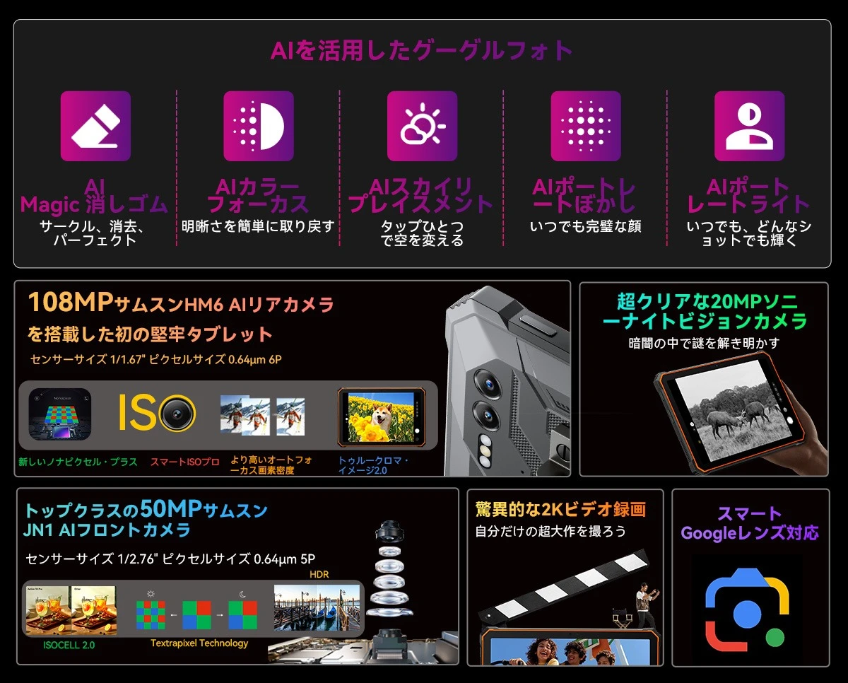 前面には50MPフロントカメラを、背面には108MPメイン(Samsung)+20MP赤外線暗視(Sony)の2眼構成カメラを搭載。日常生活で非常に鮮明な写真を撮影できるほか、屋外の暗闇でもクッキリとした写真を撮影できます。