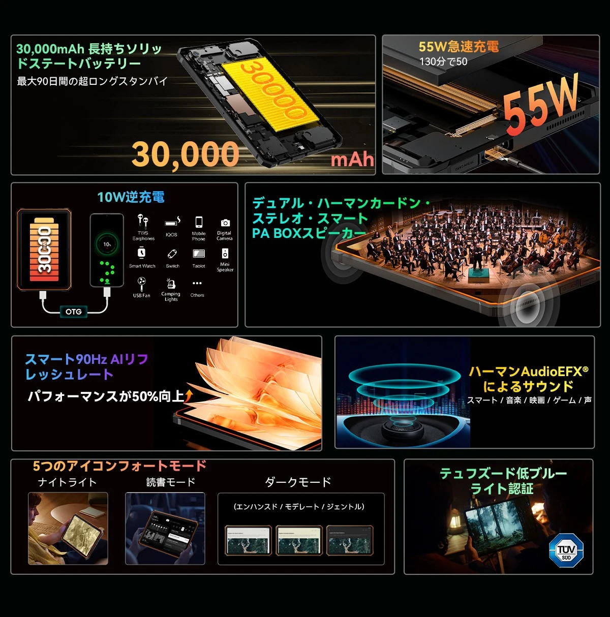 MIL-STD-810Hの耐衝撃規格、およびIP68・IP69Kの防水防塵規格に対応した非常に頑丈なタフネスタブレットです。筐体背面には400ルーメンの高輝度キャンプライトを搭載するほか、30,000mAhの大容量バッテリーを内蔵しており、アウトドア利用にはうってつけ。