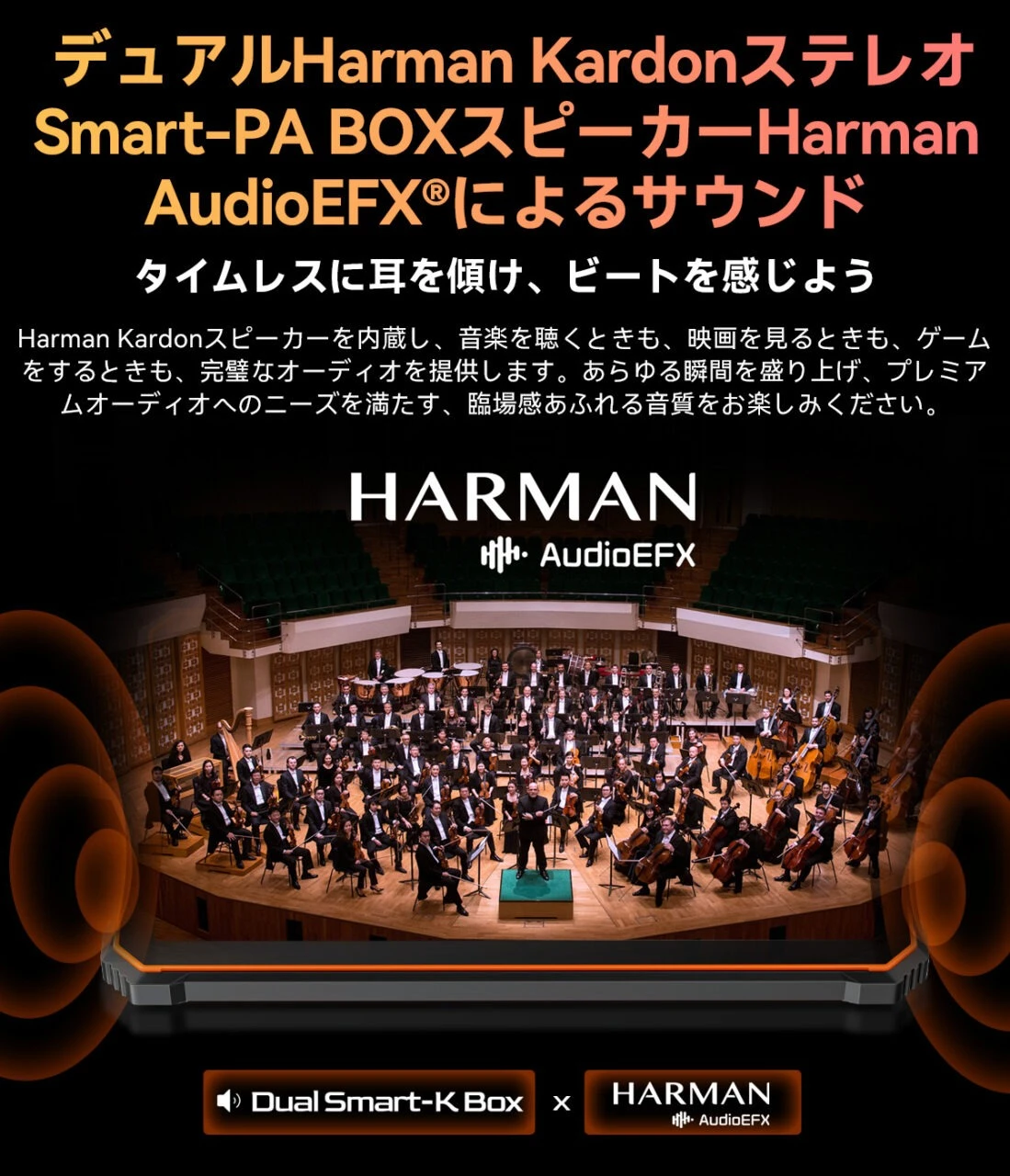 Harman Kardon® ステレオ・スマートPAボックススピーカーを内蔵。Harman Kardon® AudioEFXサポートにより、臨場感のあるサウンドを楽しめます。