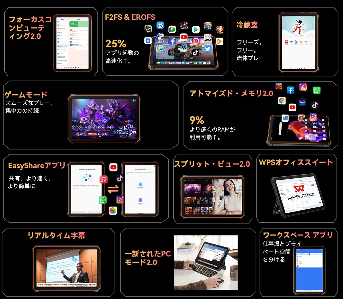 OSには「DokeOS_P 4.0」(Android 14ベース)を採用。PCモードをサポートするほか、画面分割モード、画像編集機能、ゲームモードなど、バリエーション豊かな便利機能を利用出来ます。