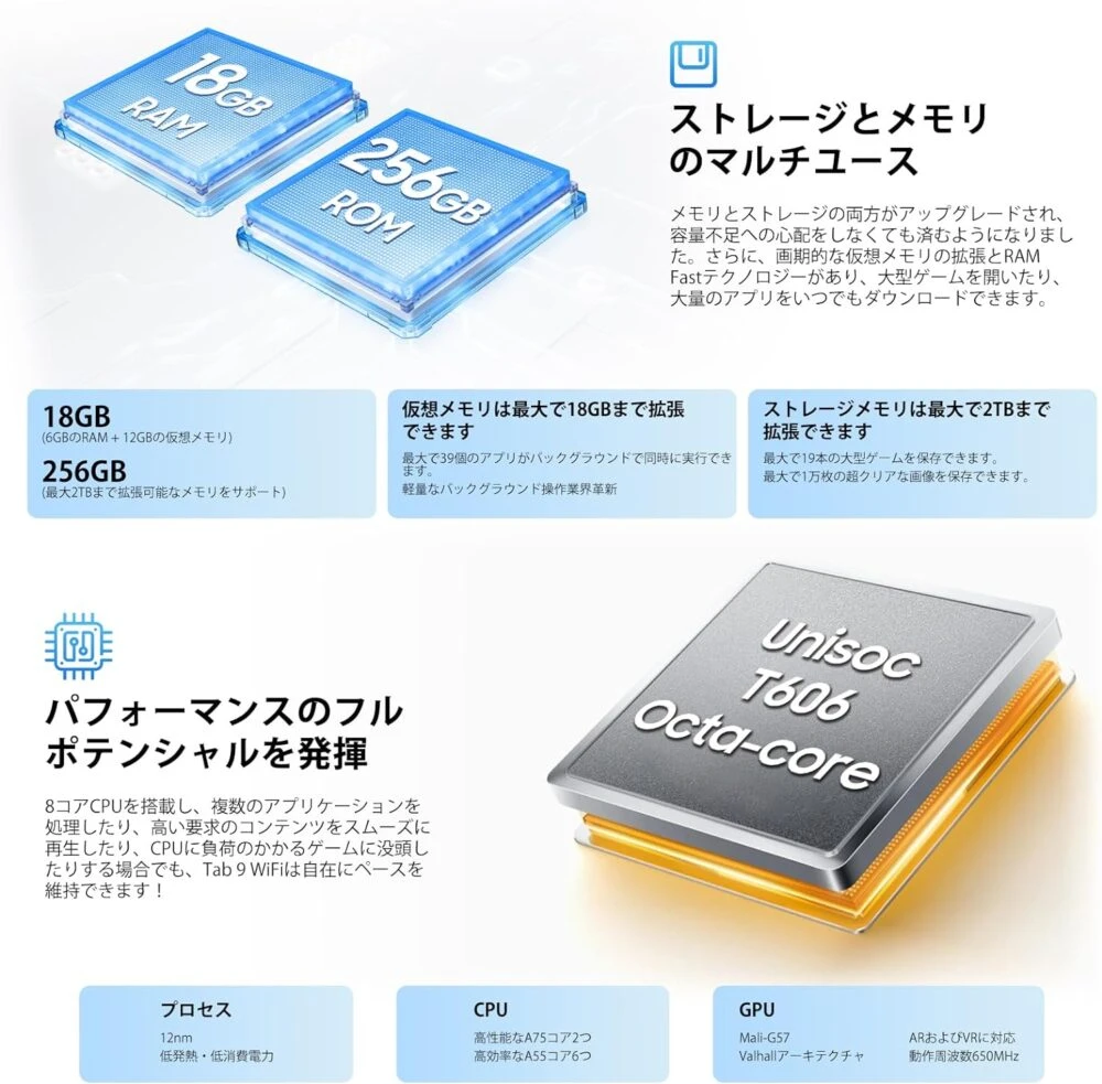 CPU(SoC)にはUnisoc T606 オクタコアプロセッサーを、RAMは6GBを採用。一般的なタブレット用途は問題なくスムーズにこなせるだけの性能を擁しています。RAMは最大18GBまでの拡張が可能で、よりスムーズなタブレット操作を楽しめるようになります。