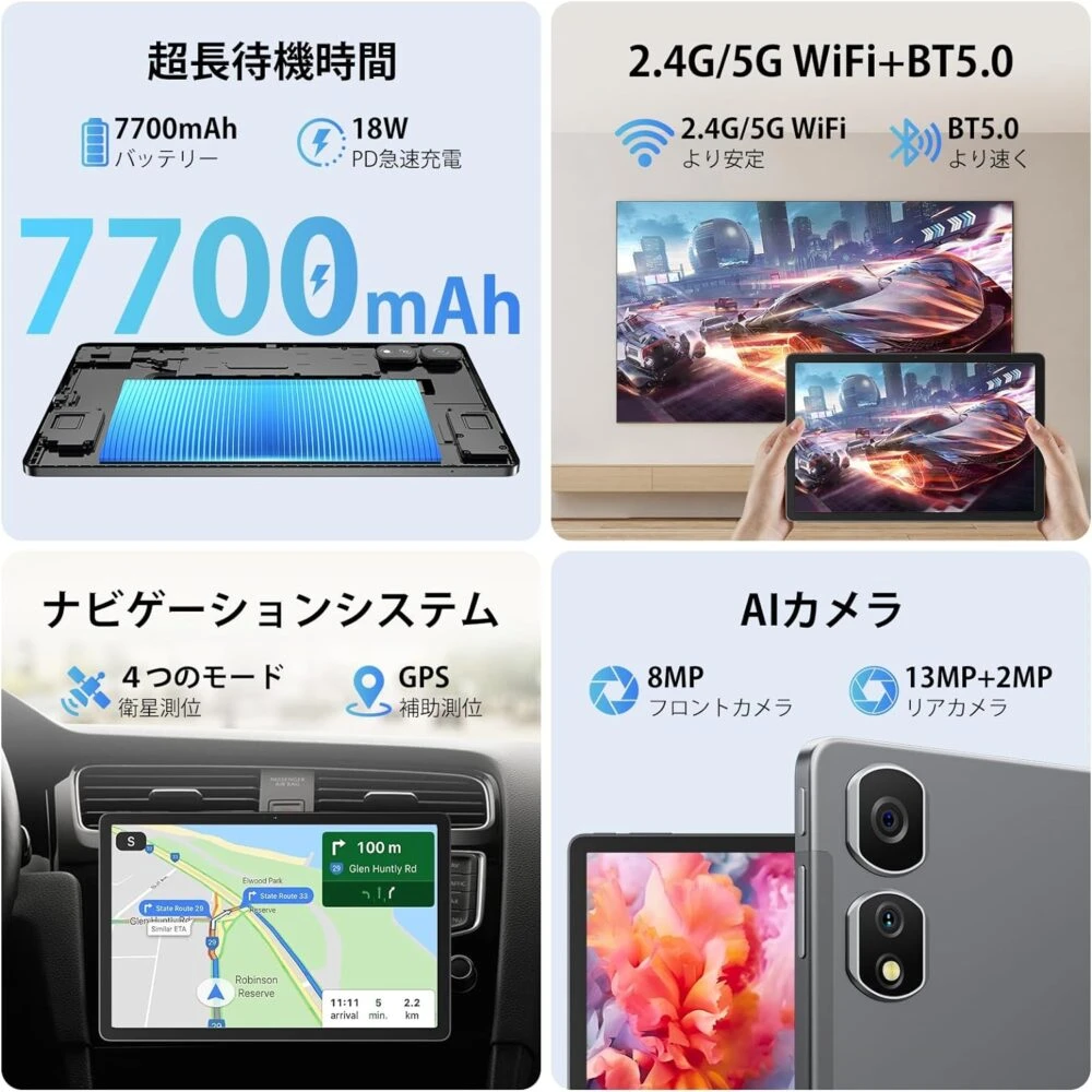 てバッテリー容量は7,700mAhと大容量であり、長時間の連続使用が可能。外出先でも安心して長時間利用でき、利便性に優れていると言えます。18W急速充電にも対応。