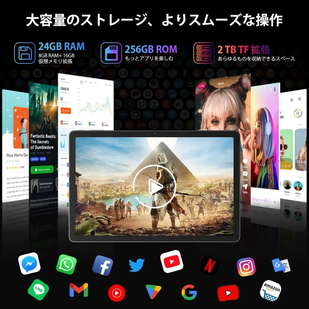 CPU(SoC)にはUNISOC T616オクタコアプロセッサーを、RAMは8GB LPDDR4Xを採用。一般的なタブレット用途は問題なくスムーズにこなせるだけの性能を擁しています。RAMは最大24GBまでの拡張が可能で、よりスムーズなタブレット操作を楽しめるようになります。