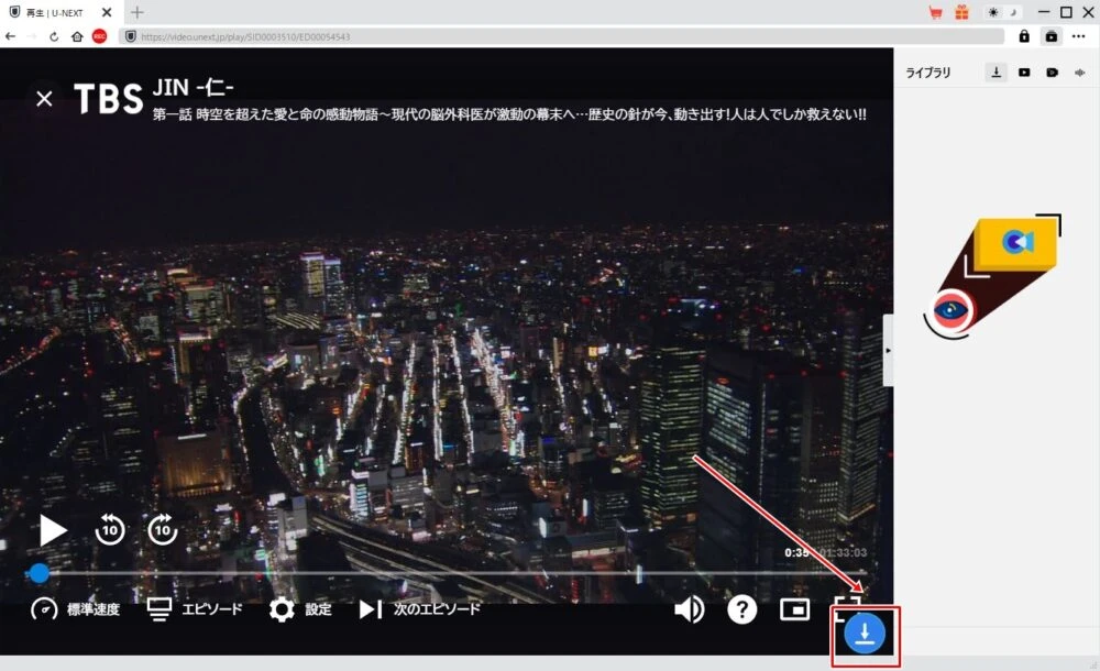 動画再生時に、画面右下に表示されているダウンロードアイコンをクリックします。