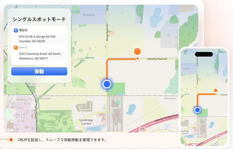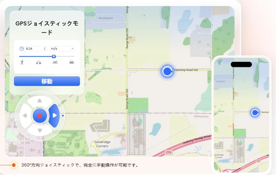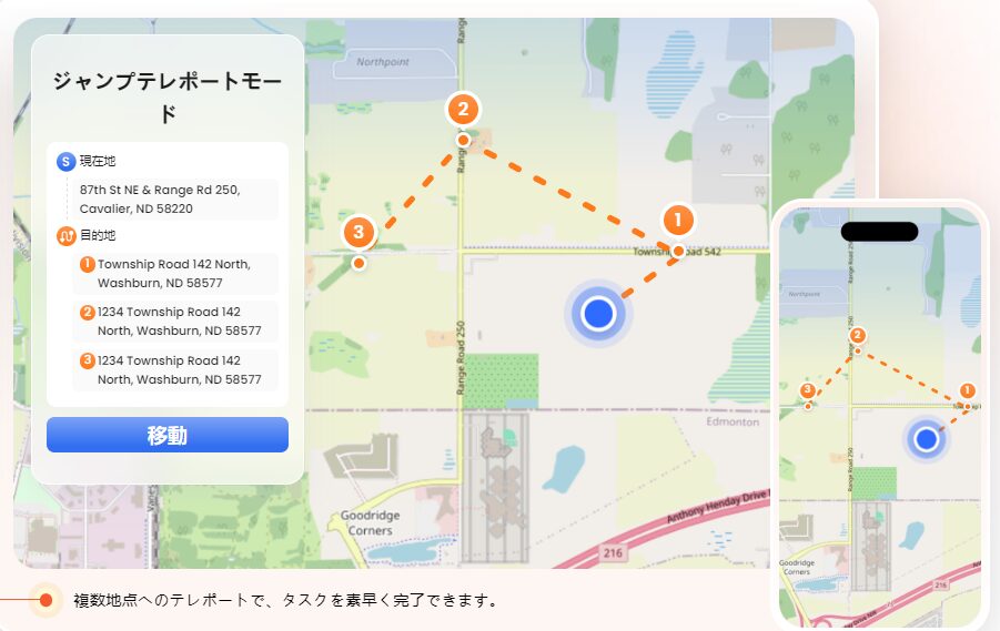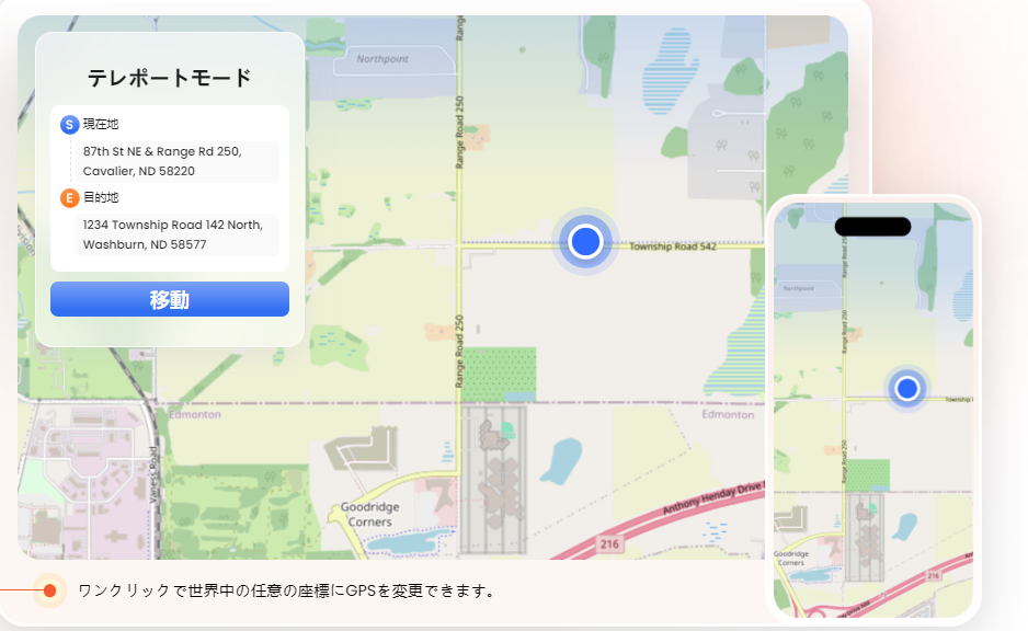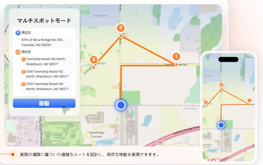 「移動」ボタンをクリックすると、スマートフォンのGPS位置が即座に変更されます。変更後は、対応しているゲームやSNSアプリにもリアルタイムで反映されます。