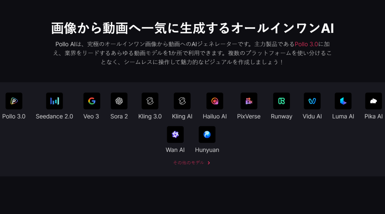 また、このプラットフォームの特徴として、Veo、Kling AI、Wan AI、Runway、Luma AI、Pika AIなど、複数の主要動画生成モデルを一つの環境内で利用できる点が挙げられる。これにより、異なるモデルごとの出力傾向を比較しながら生成を行うことができ、用途に応じた選択が可能とされている。追加の編集工程を必要とせず、画像から動画生成を一貫して行える設計になっている点も特徴である。