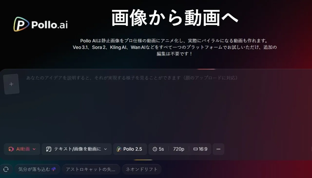 Pollo AIは、写真を動画に変換できるオールインワン型AIプラットフォームとして位置付けられている。画像から動画への変換機能により、1枚の写真をプロ仕様の動画へアニメーション化することが可能であり、シーンによってはバイラルコンテンツとして成立するレベルの映像生成も確認されている。ユーザーは画像をアップロードし、簡単なプロンプトを入力するだけで、人物の動きや背景の変化を含む動画を生成できる仕組みとなっている。