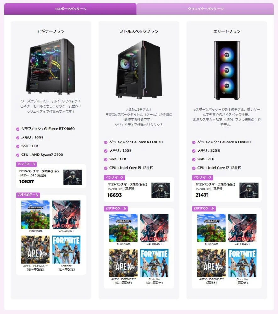 物件ごとにゲーミングプランが設定されており、モニター+ゲーミングPCのセットをレンタルできます。