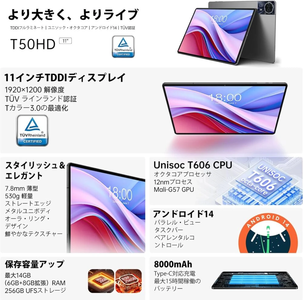 『TECLAST T50HD』は、1,920×1200(FHD+)解像度対応の11インチディスプレイを搭載した、格安Androidタブレットです。