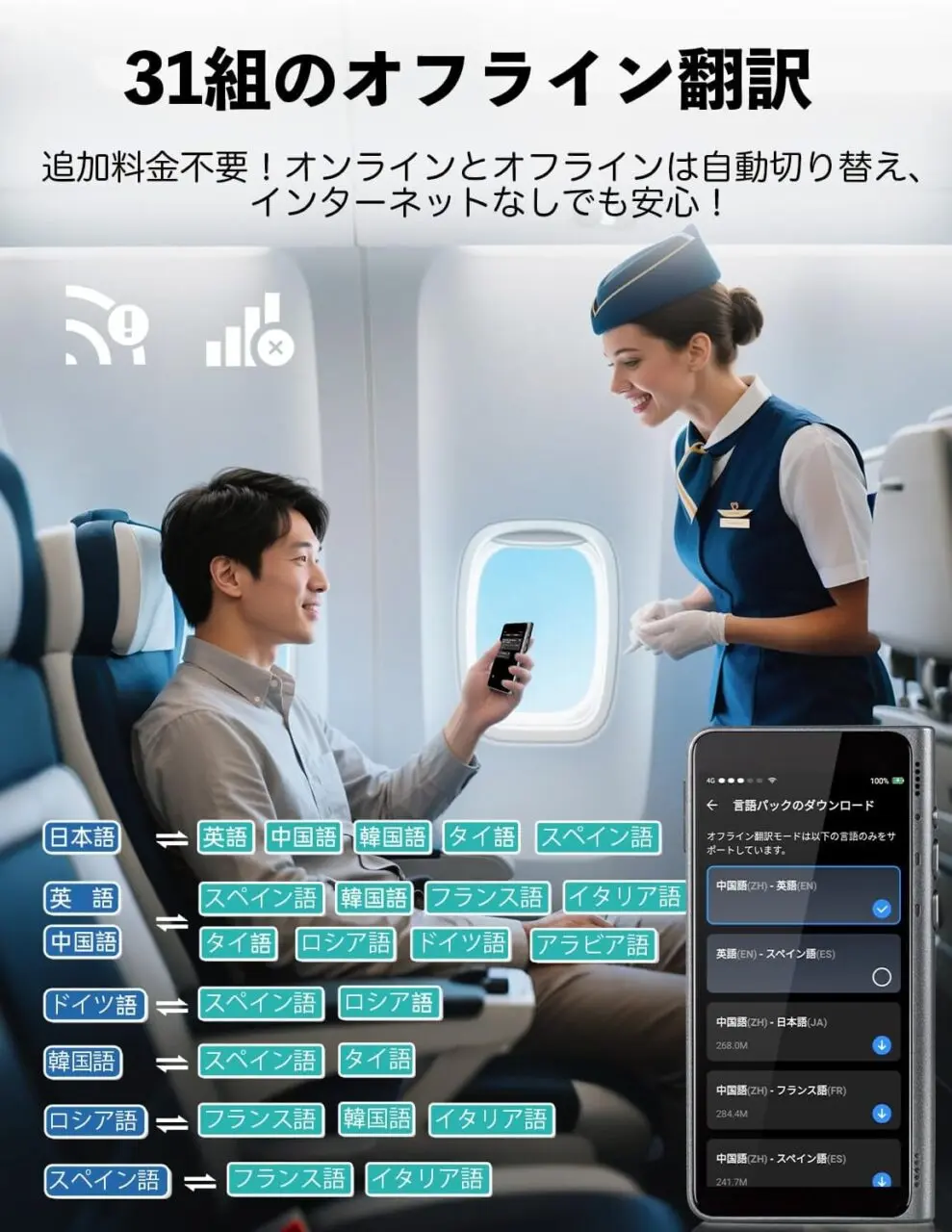 2022年発売の旧モデルでは、オフライン翻訳対応言語は13組のみでした。しかし2025年発売の本製品では、なんと31組まで増加しており、オフライン翻訳の実用性が大幅に向上しています。